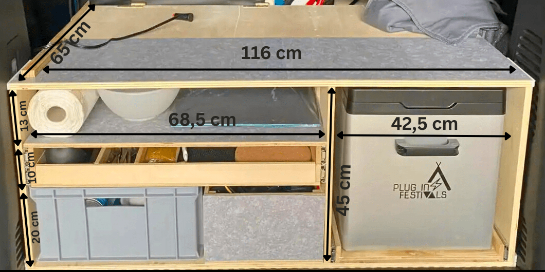 Ein wichtiger Bestandteil meiner Campingbox ist der Auszug für eine Kompressorkühlbox von Plugin Festival. Diese Box ist auf einem ausziehbaren Fach montiert, sodass sie leicht zugänglich ist und bei Bedarf herausgezogen werden kann. Das Fach ist stabil und sicher befestigt, um die Kühlbox während der Fahrt an Ort und Stelle zu halten.